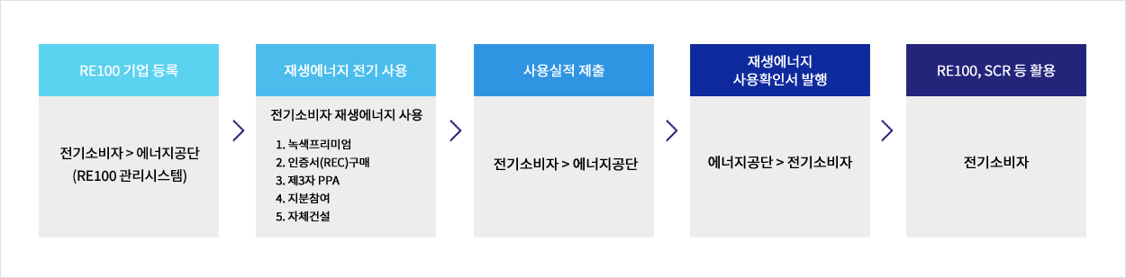 · 전기소비자는 재생에너지 전기를 사용하고 발급받은 「재생에너지 사용 확인서」를 RE100 이행 등에 활용
